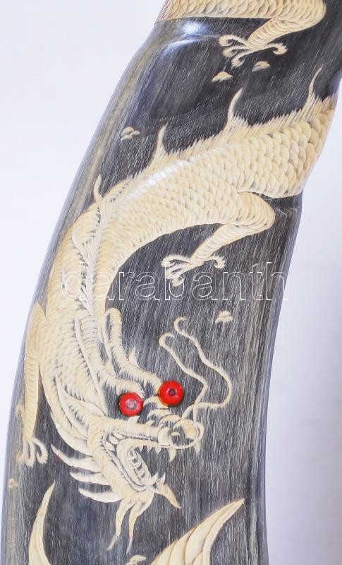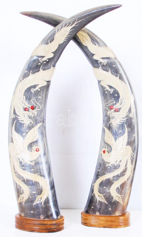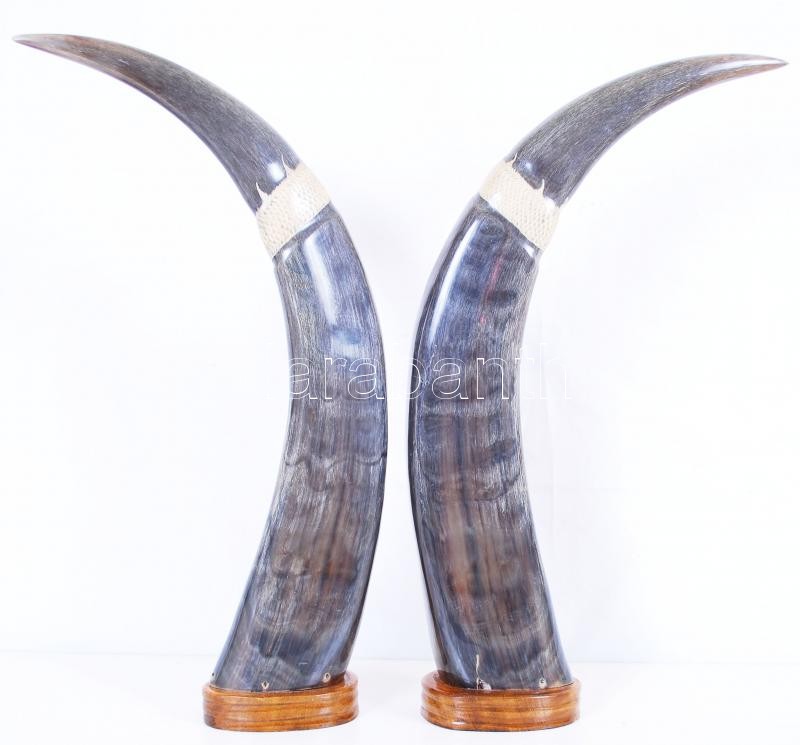 Beschreibung: Gazdagon díszített keleti tülök pár, fa talpakon, jó állapotban, m:46 cm