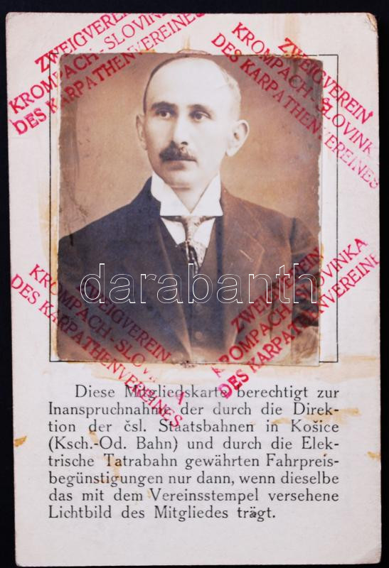 1922 A Kárpátegyesület Tátra-vasúton és vonaton is utazásra jogosító fényképes igazolványa / Id of the Karpatverein, valid for transportation in the Tatra