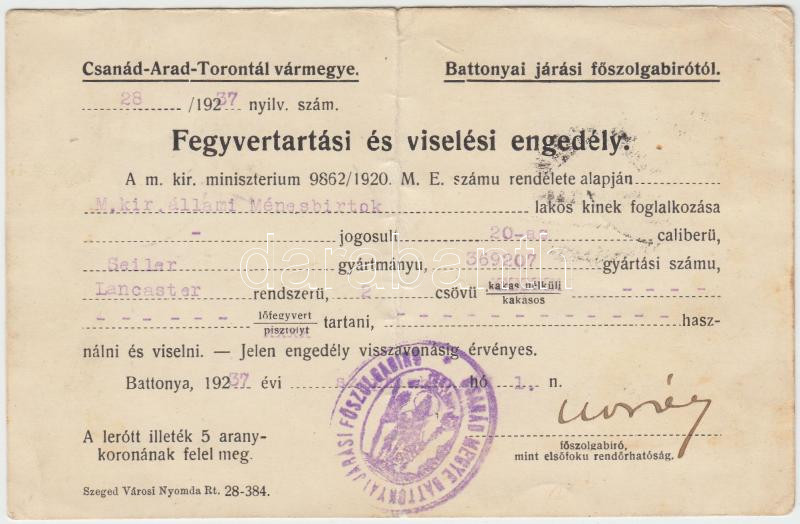 1937 Csanád-Arad-Torontál vármegye fegyvertartási és viselési engedély https://www.darabanth.com/de/183-Fernauktion/183.0/Andere-Sammelgebiete/Dokument~5200015/1937-Csanad-Arad-Torontal-varmegye-fegyvertartasi-es-viselesi-engedely~II656182