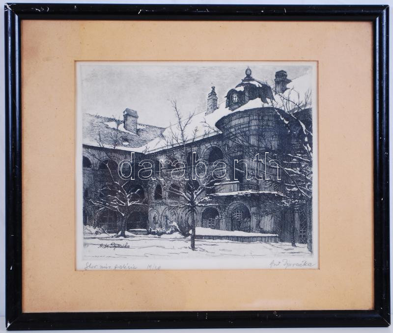 Beschreibung: Antonin Djuracka (1904-1971): Elhagyott városháza. Rézkarc, papír, jelzett, üvegezett keretben, 39×46cm