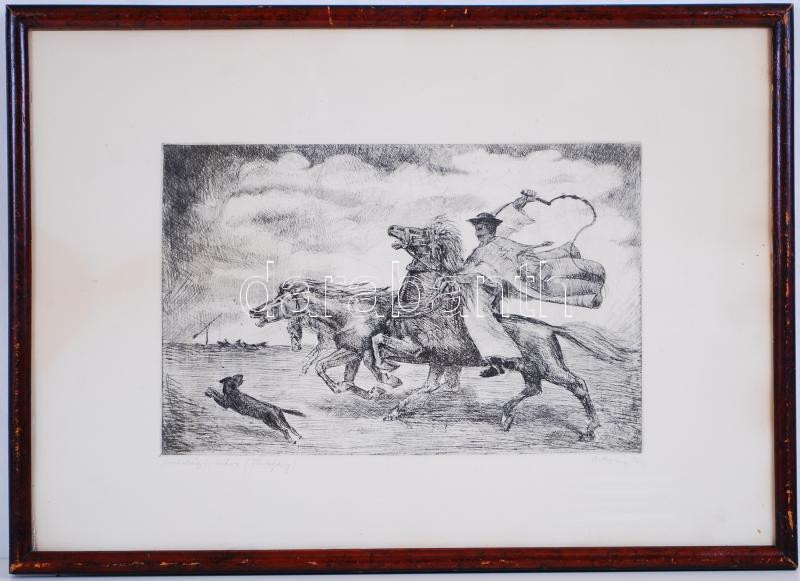 Beschreibung: Haranghy Jenő (1894-1951): Hortobágyi csikós. Rézkarc, jelzett, üvegezett keretben 37×50 cm