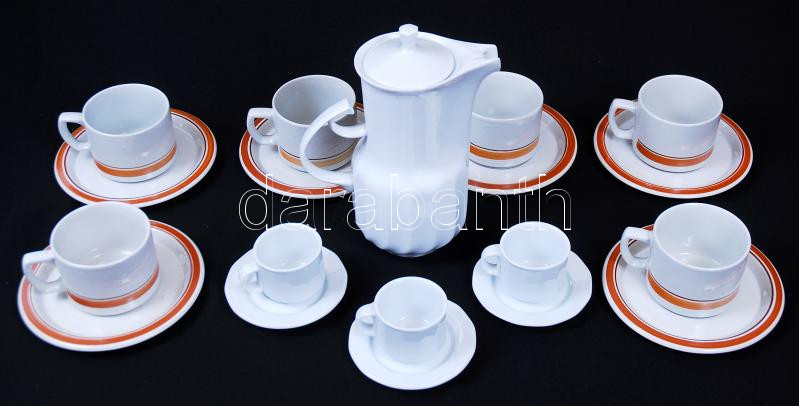 Beschreibung: Porcelán tétel: 6 Gránit teásbögre aljjal, Hollóháza kiöntő, 3 csésze aljjal