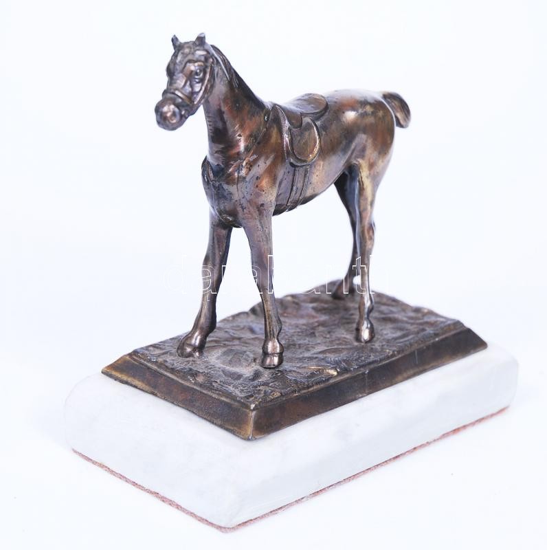 Beschreibung: Felnyergelt ló réz szobor, jelzés nélkül, márvány talapzaton, h:11 cm, m:13 cm /
