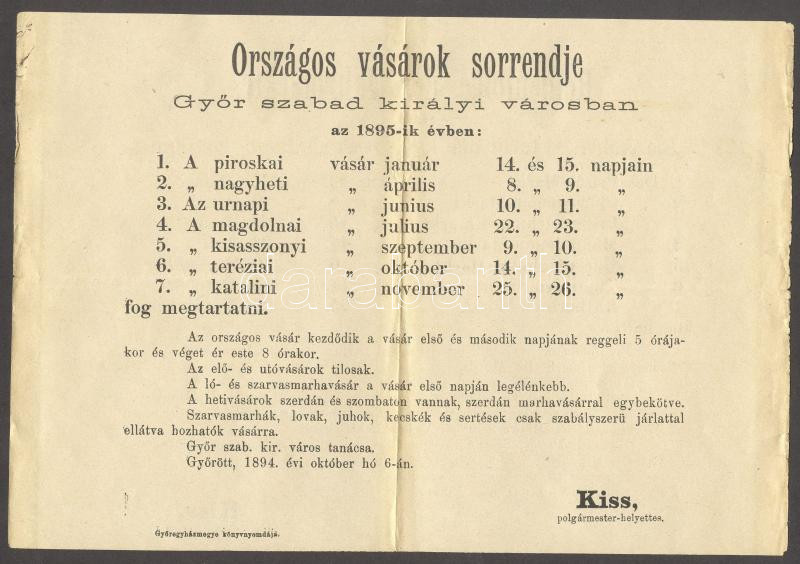 1895 Győr országos vásárok sorrendje hirdetmény magyar és német nyelve... https://www.darabanth.com/de/183-Fernauktion/183.0/Andere-Sammelgebiete/Werbungen~5200019/1895-Gyor-orszagos-vasarok-sorrendje-hirdetmeny-magyar-es-nemet-nyelven-23x26-cm~II572455