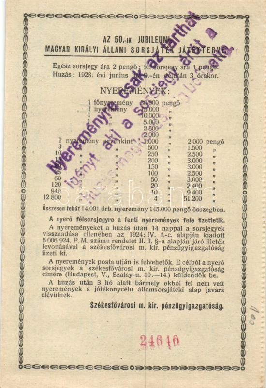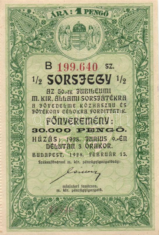 1928. "Az 50. Jubileumi Magyar Kir. Állami Sorsjáték" 1/2 "B" sorsjegy... https://www.darabanth.com/de/183-Fernauktion/183.0/Numismatik/Aktien-und-Tickets~5200125/1928-Az-50-Jubileumi-Magyar-Kir-Allami-Sorsjatek-12-B-sorsjegy-30000P-nyeremennyel-TI~II657901