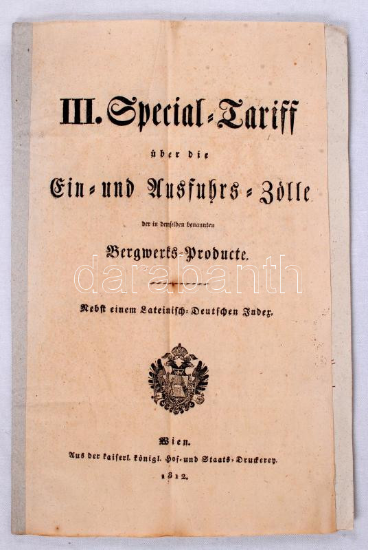1812 A bányászati termékek vámtarifájáról kiadott rendelet latin-német szótárral, valamint az ezt kihirdető helytartótanácsi levéllel, melyet Mednyánszky János tanácsos és Lány Samuel titkár saját kezű aláírásával
