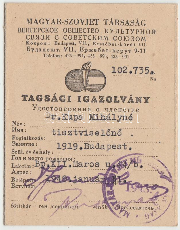1949 Magyar-Szovjet Társaság tagsági igazolvány bélyegekkel https://www.darabanth.com/de/185-Fernauktion/185.0/Andere-Sammelgebiete/Dokument~3000016/1949-Magyar-Szovjet-Tarsasag-tagsagi-igazolvany-belyegekkel~II674602