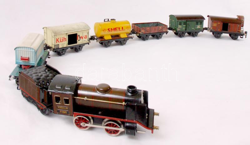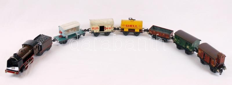 Beschreibung: Cca 1930 Marklin mozdony és vagonok, felhúzókulcs hiányzik, két vagon hiányos, jelzettek, jó állapotban, nullás méretűek, összesen: 10 db
