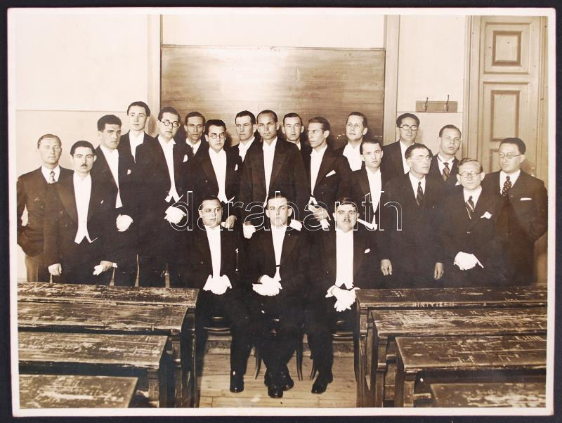 Beschreibung: 1935 Pázmány Péter Tudomány Egyetem, doktorrá avatás utáni csoport kép, 18×23 cm
