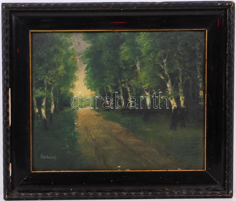 Beschreibung: Markovich jelzéssel: Út az erdőben. Olaj, karton, sérült, antik keretben 27×33 cm