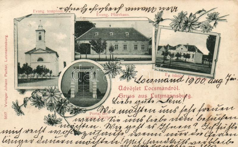 Beschreibung: Locsmánd, Lutzmannsburg; Evangelist church, school, parsonage; floral