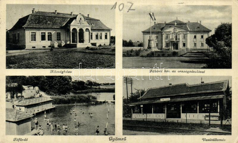 Beschreibung: Gyömrő, Főbírói hivatal országzászlóval, Tófürdő, Községháza, Vasútállomás