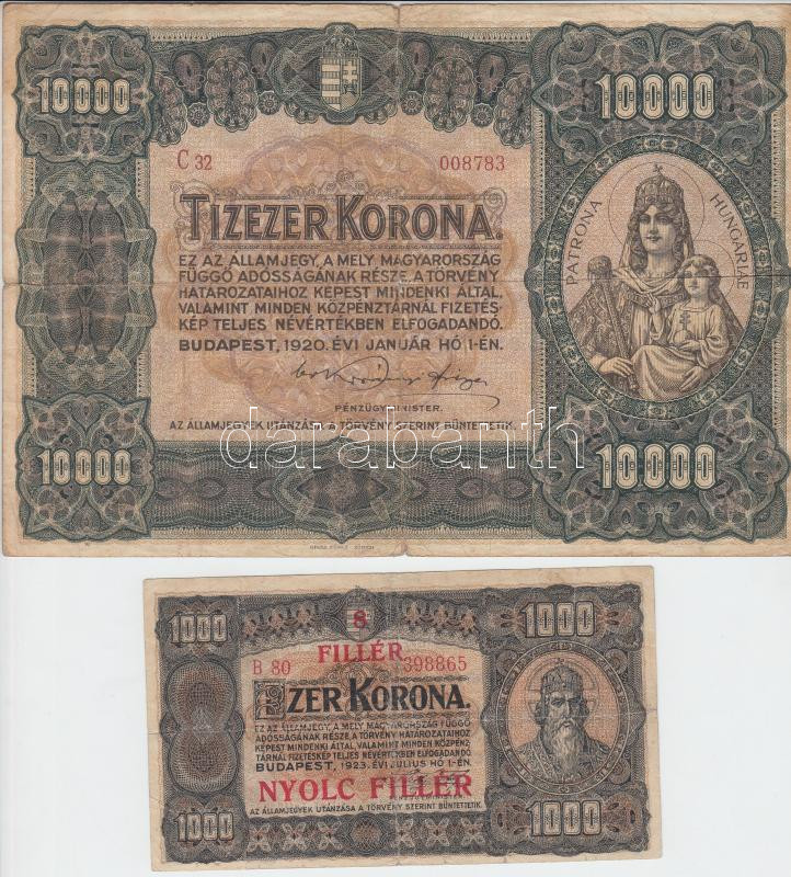 1920. 10.000K "Orell Füssli Zürich" + 1923. 1000K T.W. nyomdahely jelö... https://www.darabanth.com/de/185-Fernauktion/185.0/Numismatik/Ungarische-Banknoten~200007/1920-10000K-Orell-Fussli-Zurich-plus-1923-1000K-TW-nyomdahely-jelolessel-es-8-FILLER--NY~II676629