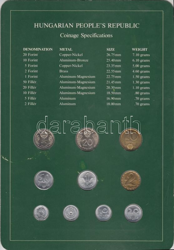 1983. 2f-20Ft 10db klf érmés forgalmi sor kartonon bélyeggel és alkalm... https://www.darabanth.com/de/185-Fernauktion/185.0/Numismatik/Ungarische-Munzen~200008/1983-2f-20Ft-10db-klf-ermes-forgalmi-sor-kartonon-belyeggel-es-alkalmi-belyegzovel-T1~II671606