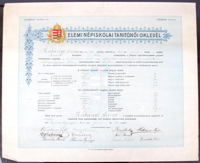 1913 Tanítónői oklevél, 38×44 cm https://www.darabanth.com/de/186-Fernauktion/186.0/Andere-Sammelgebiete/Dokument~680062/1913-Tanitonoi-oklevel-38C39744-cm~II681130