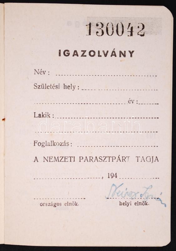 Cca 1948 Nemzeti Parasztpárt kitöltetlen igazolványa https://www.darabanth.com/de/186-Fernauktion/186.0/Andere-Sammelgebiete/Dokument~680062/Cca-1948-Nemzeti-Parasztpart-kitoltetlen-igazolvanya~II682851