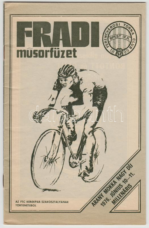 1976 Fradi Műsorfüzet. Az FTC kerékpár-szakosztályának történetéből. A... https://www.darabanth.com/de/186-Fernauktion/186.0/Andere-Sammelgebiete/Drucksachen~8000026/1976-Fradi-Musorfuzet-Az-FTC-kerekpar-szakosztalyanak-tortenetebol-Arany-Mokka-Nagy-Dij~II682162