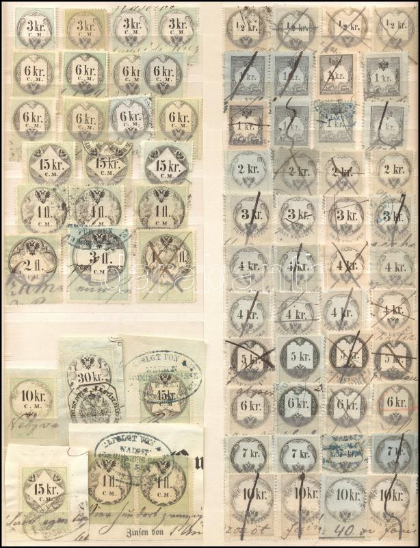 Beschreibung: 71 db régi okmánybélyeg berakólapon
