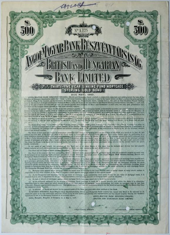 Beschreibung: Budapest 1928. "Angol-Magyar Bank Részvénytársaság" 7 1/2%-kal kamatozó aranykötvény 500Ł-ról T:III