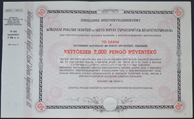 Budapest 1946. "Kőbányai Polgári Serfőző és Szent István Tápszerművek ... https://www.darabanth.com/de/186-Fernauktion/186.0/Numismatik/Aktien-und-Tickets~5/Budapest-1946-Kobanyai-Polgari-Serfozo-es-Szent-Istvan-Tapszermuvek-Reszvenytarsasag~II680005