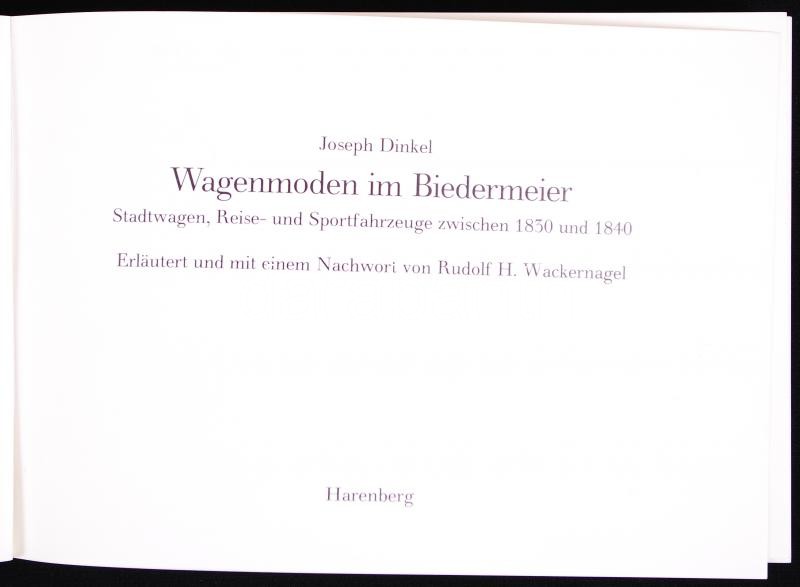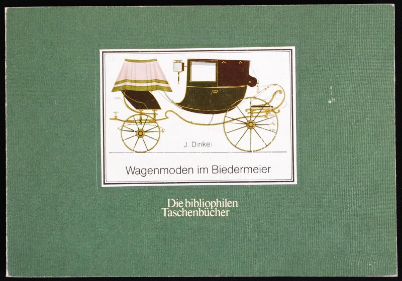 Joseph Dinkel: Wagenmoden im Biedermeier. Stadtwagen, Reise- u. Sportfahrzeuge zwischen 1830 u. 1840. Erl. u. mit e. Nachw. von Rudolf H. Wackernagel. Die Bibliophilen Taschenbücher Nr. 239. Dortmund, 1981, Harenberg. Reprint. Színes lovaskocsi-katalógus reprint változata papírkötésben /
