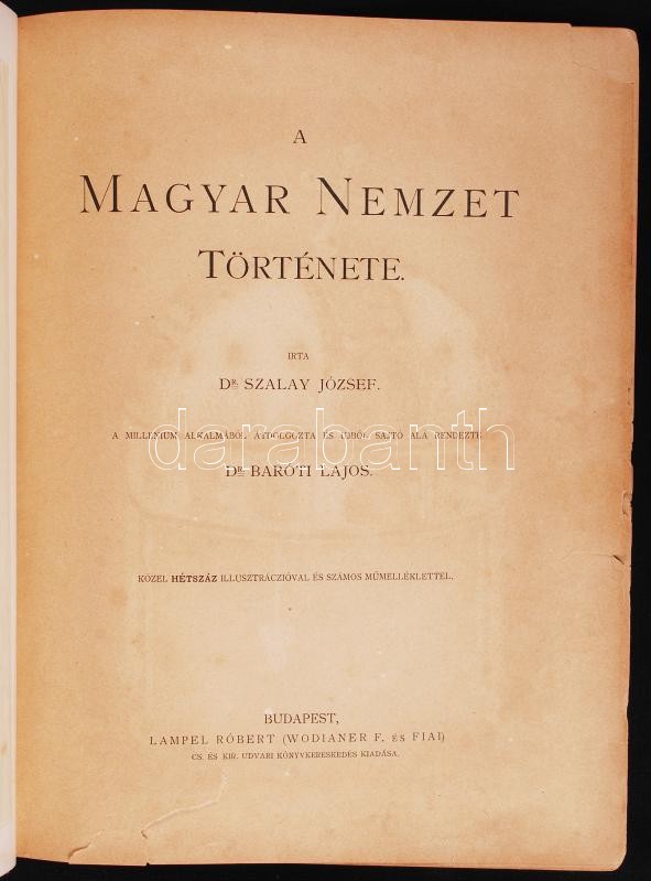 Dr.Szalay József- Dr.Baróti Lajos: A Magyar Nemzet Története I. köt: Magyarország az Árpádház kihaltáig. Bp., [1895-1898], Lampel Róbert. 248 szövegképpel és 36 műmelléklettel. Kiadói, festett, dombornyomott félbőr kötésben