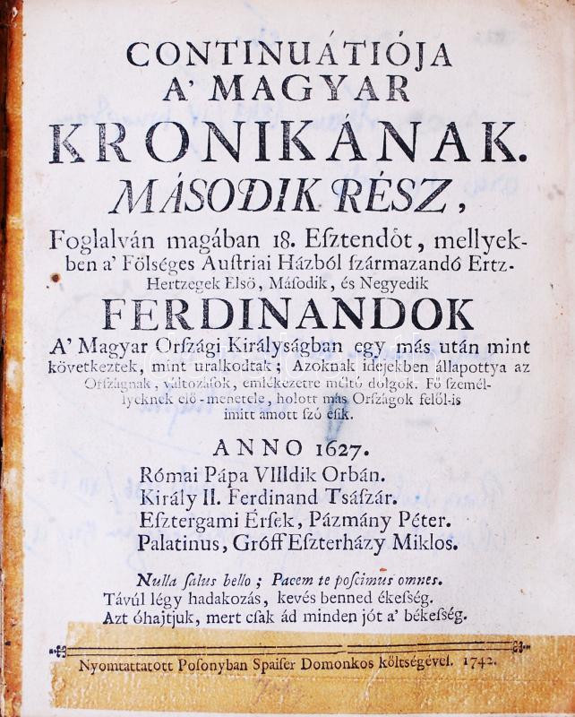 Kovács János: A magyar kronikának rövideden le-rajzolt sómmája, mellynek az elsö része Pethö Gergely munkájábúl szedegettetett, rész szerént külömb külömb féle könyvekbül-is bövittetett, a második része penig némelly irásokbúl ki-vétetett, és a ma... Első, Második, Harmadik rész. Posonyban, 1742. Spaizer Domonkos Ferencz. 200p. + 176p. + 112 p.Az első 26 oldal és az utolsó 8 oldal hiányzik.