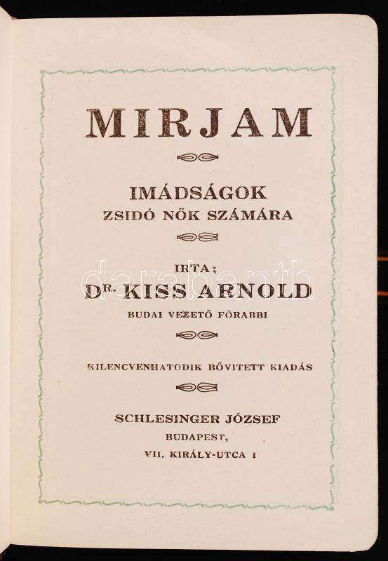 Dr. Kiss Arnold: Mirjam. Imádságok zsidó nők számára. 96. bővített kiadás. Schlesinger Jos. Kiadói, Budapest. Kisalakú könyv bőrkötésben, aranyozott lapszélekkel, jó állapotban.