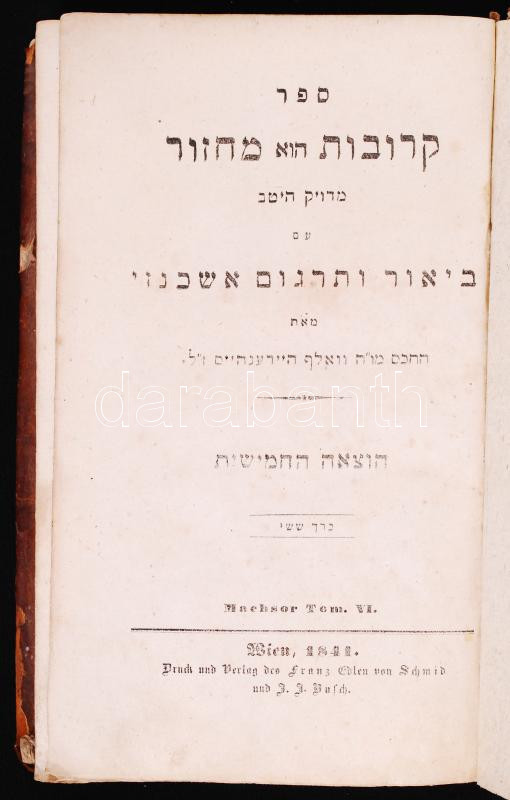 Zsidó imakönyv. Machsor Tom. VI. Bécs 1841. Héber nyelven. Dombornyomo... https://www.darabanth.com/de/187-Fernauktion/187.0/Andere-Sammelgebiete/Bucher-Judaica~6000038/Zsido-imakonyv-Machsor-Tom-VI-Becs-1841-Heber-nyelven-Dombornyomott-borkotesben~II692444