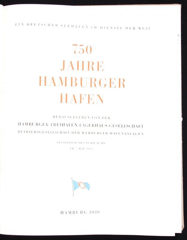 750 Jahre Hamburger Hafen. Herausgegeben von der Hamburger freihafen- lagerhaus - gesellschafet. Betriebsgesellschaft der Hamburger hafenanlagen. Anlässlich des jubiläums AM 7. MAI 1939. Német nyelvű könyv, a hamburgi kikötőről. Hamburg, 1939. k.n. Festett, egészvászon kötésben.