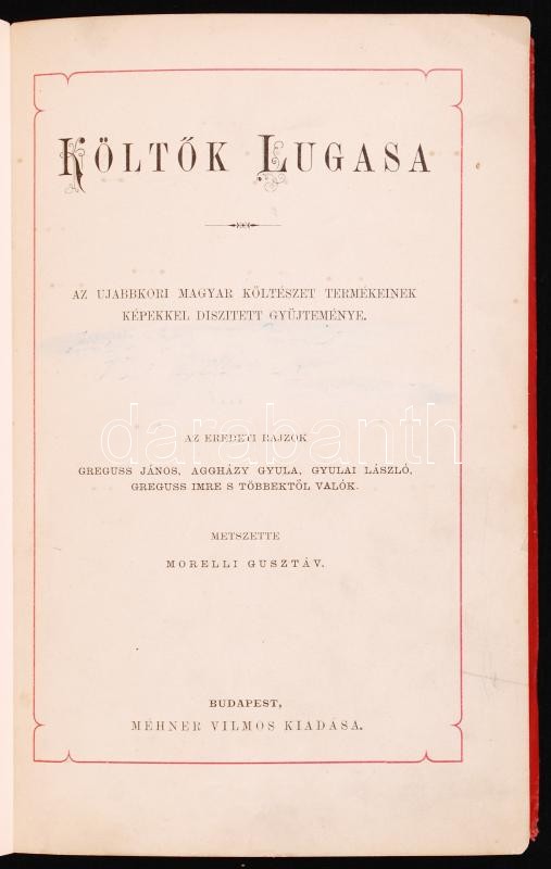 Költők lugasa. Az ujabbkori magyar költészet termékeinek képekkel diszitett gyüjteménye. Az eredeti rajzok Greguss Imre, Aggházy Gyula, Gyulai László, Greguss János s többektől valók. Metszette Morelli Gusztáv. Bp., (1891), Méhner Vilmos. Az eredeti, kiadói, aranyozott, festett egészvászon kötés felhasználásával újrakötve (a címlapon, a tulajdonosi lapon és az első lapon törölt beírások, a tartalomjegyzékben néhány aláhúzás)