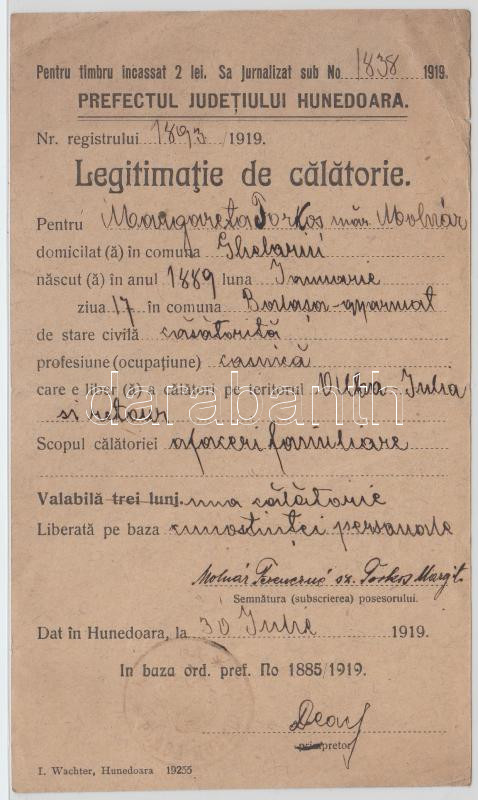 1919 A román megszálló hatóságok által kiadott utazási igazolvány Vajd... https://www.darabanth.com/de/187-Fernauktion/187.0/Andere-Sammelgebiete/Dokument~6000015/1919-A-roman-megszallo-hatosagok-altal-kiadott-utazasi-igazolvany-Vajdahunyadtol-Gyulafehe~II691909