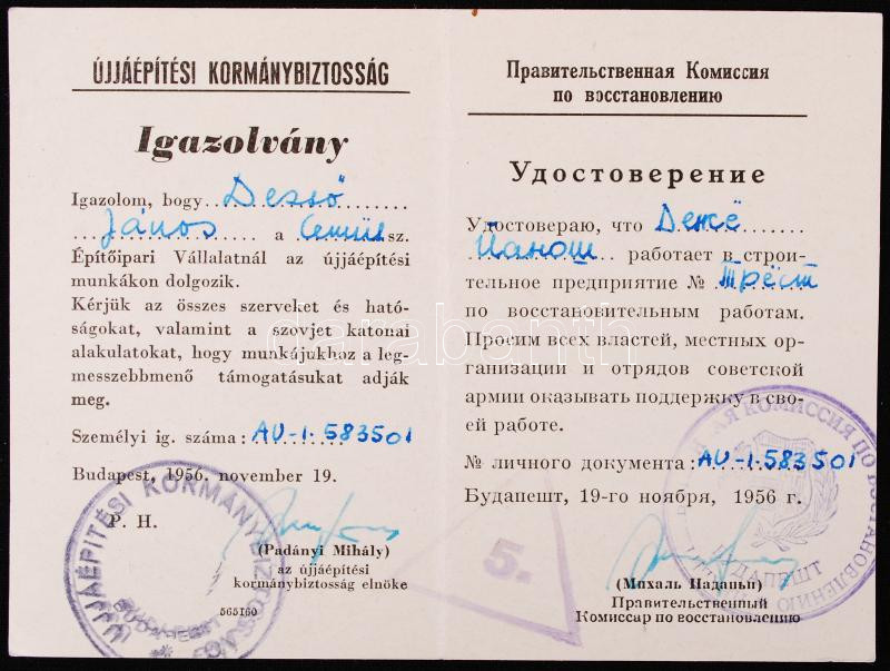 Beschreibung: 1956 Nov. 19. Újjáépítési Kormánybiztosság kiadott igazolvány, két nyelvű, Kossuth címerrel