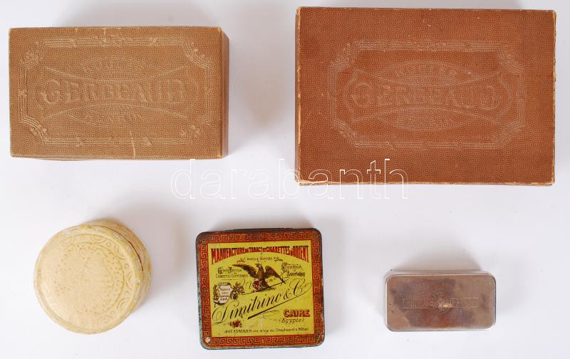 Beschreibung: 2db fém doboz (cigarettás) + 3db papír doboz (közte 2db Gerbaud, az egyik fedelén szakadás), különböző méretben