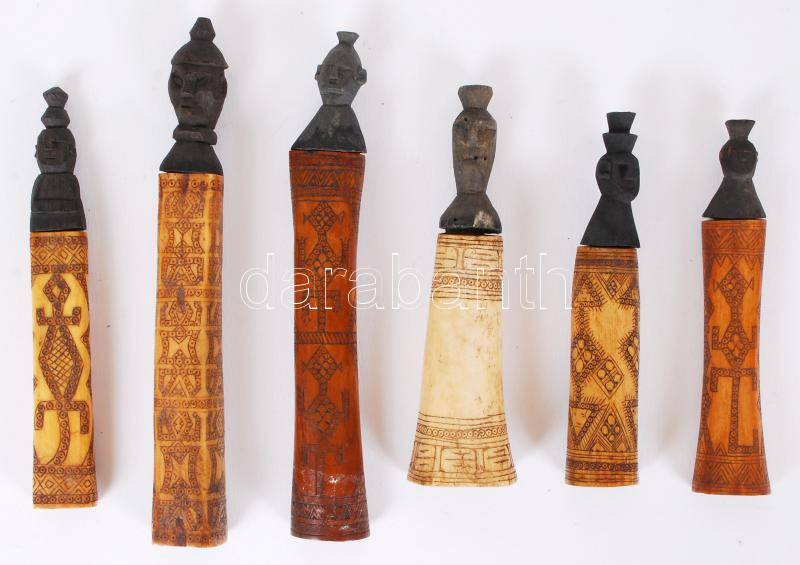 Beschreibung: Indonéziából származó, 6db vésett csont amulett, fából faragott emberfejet ábrázoló dugóval, különböző méretű