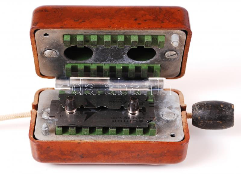 cca 1960 antik, működő, kézi borotvapenge élező / razor blade sharpene... https://www.darabanth.com/de/187-Fernauktion/187.0/Andere-Sammelgebiete/Flohmarkt~6000012/cca-1960-antik-mukodo-kezi-borotvapenge-elezo-razor-blade-sharpener-6x4cm~II693030