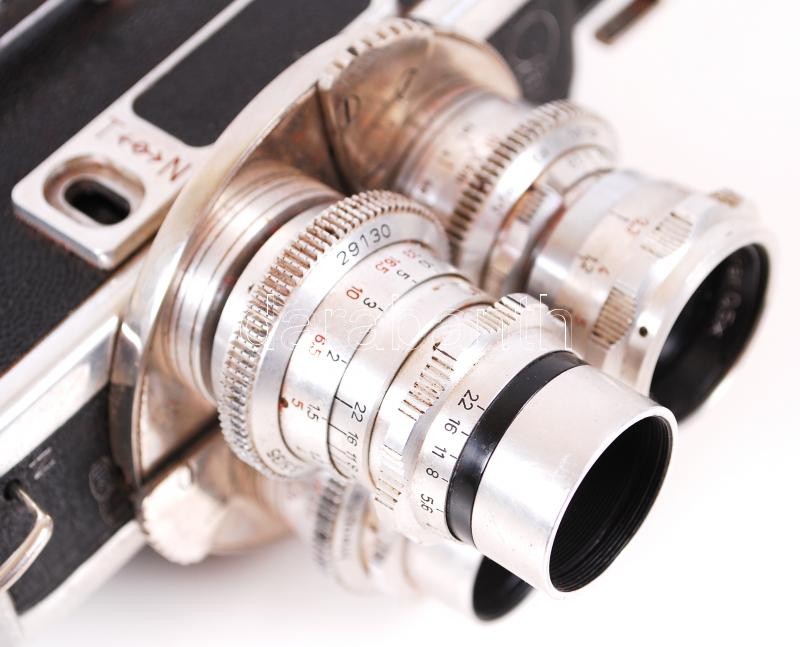 Meopta A8lla filmfelvevő kamera, felhúzhatós, három objektíves, eredeti bőr táskájában, 24×19 cm