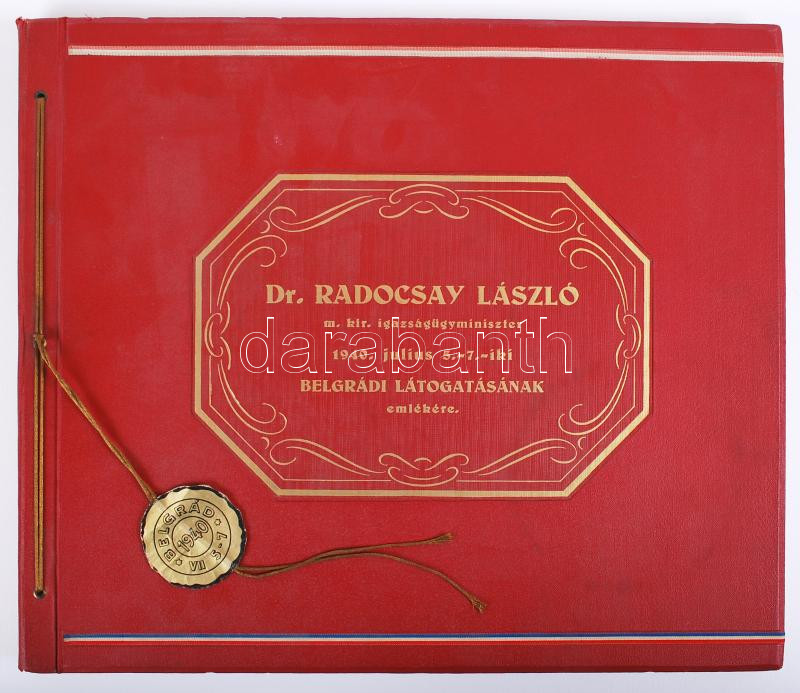 1940 "Dr. Radocsay László m. kir. igazságügyminiszter 1940. julius 5.-7.-i belgrádi látogatásának emlékére", a posztját 1939 és 1944 között a Magyar Élet Pártja színeiben betöltő miniszter politikai útjáról készült propaganda album 21db nyomtatott fotóval és magyarázó szövegekkel