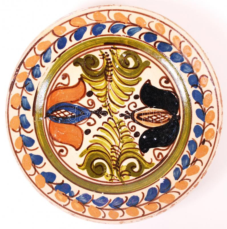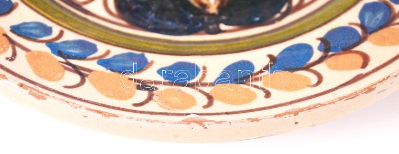 Beschreibung: Jelzés nélküli, kézzel festett, népi kerámia, fali dísztányér. Apró mázhibákkal. d: 19cm.