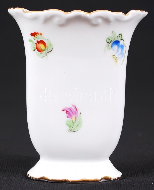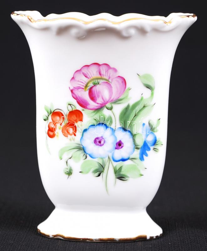 Beschreibung: Virágokkal díszített, kézzel festett és aranyozott, domború díszítésű, jelzett Herendi fogpiszkálótartó /