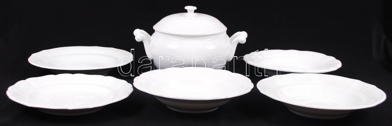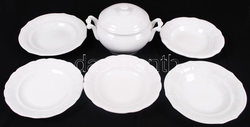 Beschreibung: cca 1900 Századfordulós jelzett karlsbadi porcelán levesestál hozzávaló 5 db tányérral / Karlsbad china soup-pan with 5 plates
