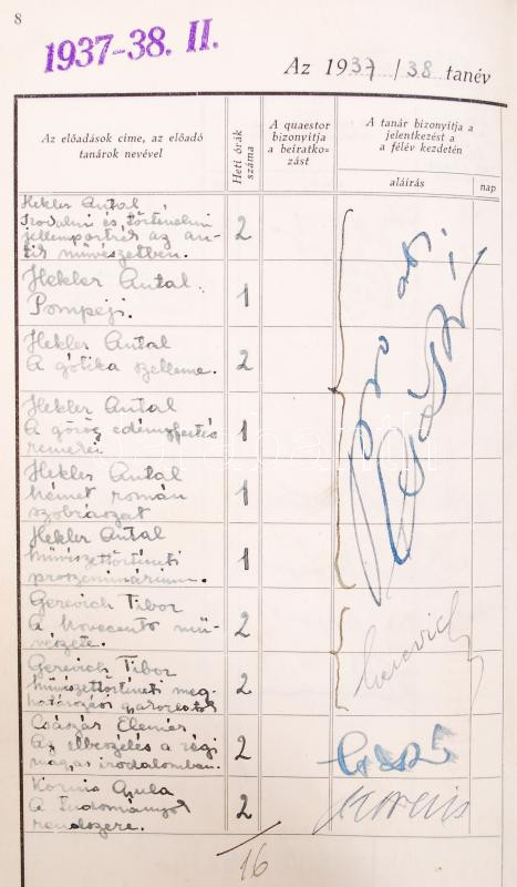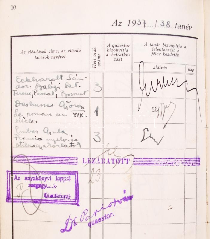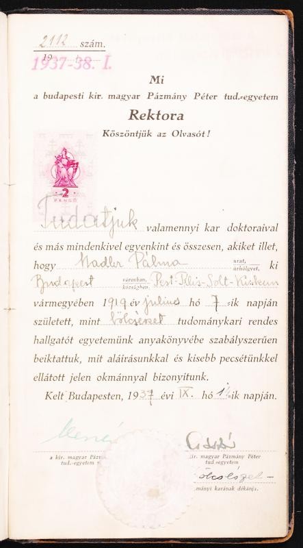 1937 Nádler Pálma írónő, Nádler Róbert (1858-1938) festőművész lányának indexe a Pázmány Péter Tudományegyetem (ma ELTE) Bölcsészettudományi karáról sok neves professzor (Eckhardt Sándor, Hekler Antal, Gerevich Tibor, báró Brandenstein Béla, etc.) aláírásával