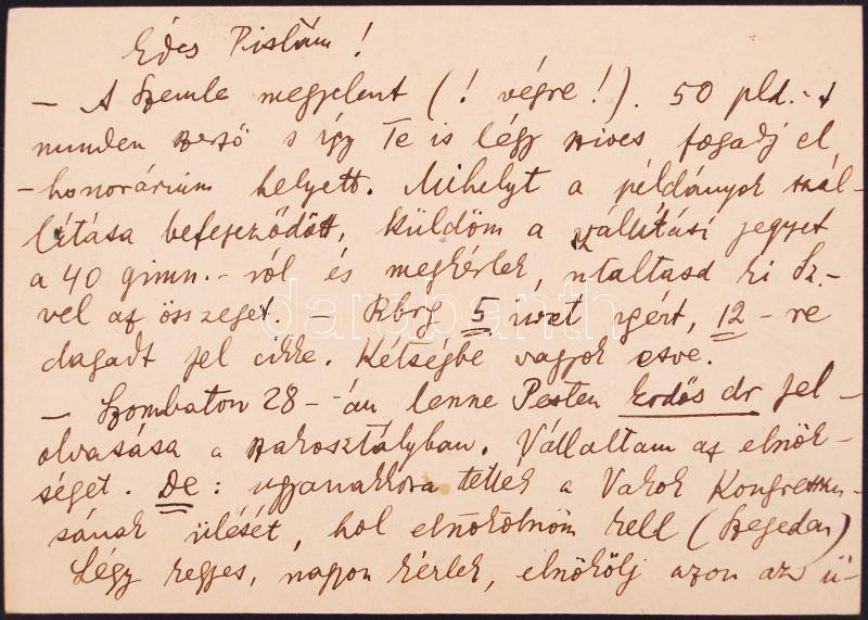 Beschreibung: 1939 Várkonyi Hildebrand Dezső (1888-1971) bencés rendi szerzetes, filozófus, pedagógus, pszichológus aláírása levelezőlapon