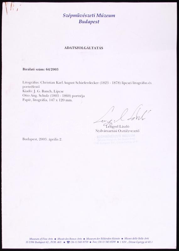 Beschreibung: Christian Karl Augus Schieferdecker (1823-1878): Otto Ang. Schulz portréja. Litográfia 14×12 cm. Szakvéleménnyel.