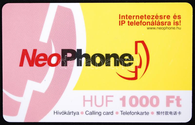 1db magyar NeoPhone telefonkártya, internetezésre és IP telefonálásra ... https://www.darabanth.com/de/187-Fernauktion/187.0/Andere-Sammelgebiete/Telefonkarte~6000021/1db-magyar-NeoPhone-telefonkartya-internetezesre-es-IP-telefonalasra-is-HUF-1000-Ft~II694401