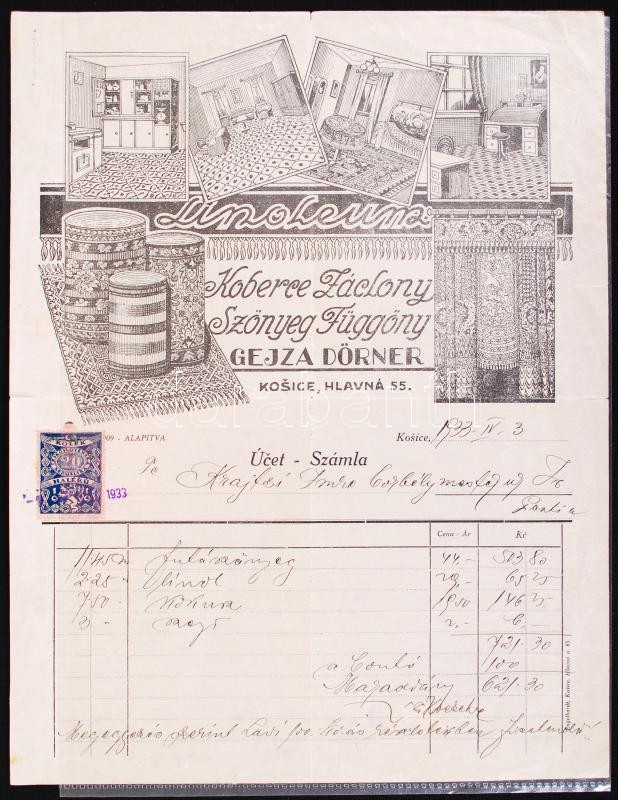 1933 Dörner Géza díszes számlája Csehszlovák illetékbélyeggel Kassáról... https://www.darabanth.com/de/187-Fernauktion/187.0/Andere-Sammelgebiete/Werbungen~6000019/1933-Dorner-Geza-diszes-szamlaja-Csehszlovak-illetekbelyeggel-Kassarol~II694295
