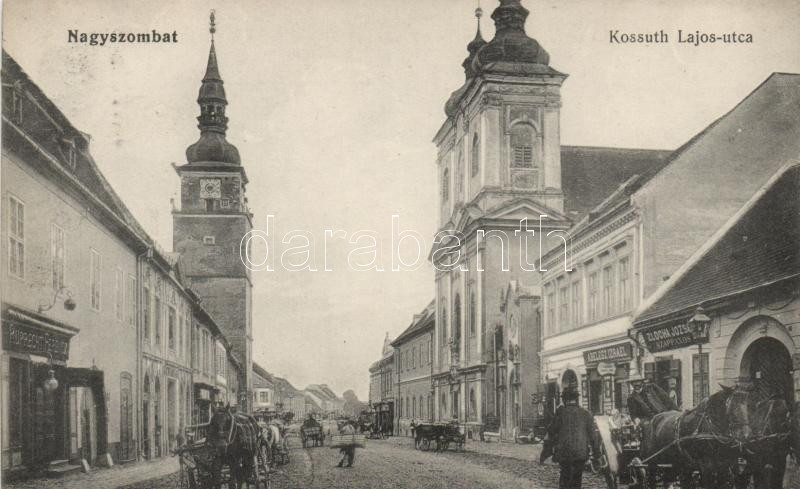 Nagyszombat Kossuth street, the shops of József Zlocha, Izrael Abelesz... https://www.darabanth.com/de/187-Fernauktion/187.0/Ansichtskarten/Slowakei~3000006/Nagyszombat-Kossuth-street-the-shops-of-Jozsef-Zlocha-Izrael-Abelesz-and-Ferenc-Ruprecht-small-t~II685978