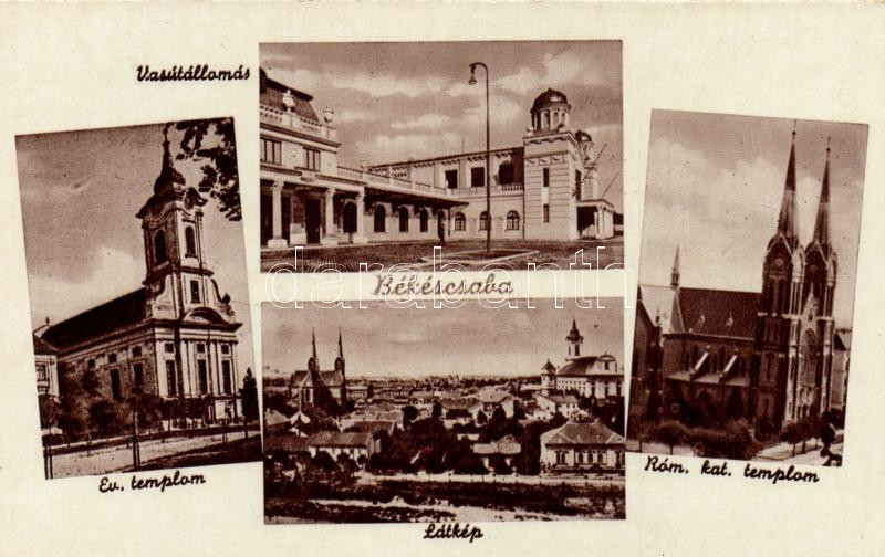 Békéscsaba vasútállomás, evangélikus és katolikus templomok https://www.darabanth.com/de/187-Fernauktion/187.0/Ansichtskarten/Ungarn~3000004/Bekescsaba-vasutallomas-evangelikus-es-katolikus-templomok~II690370