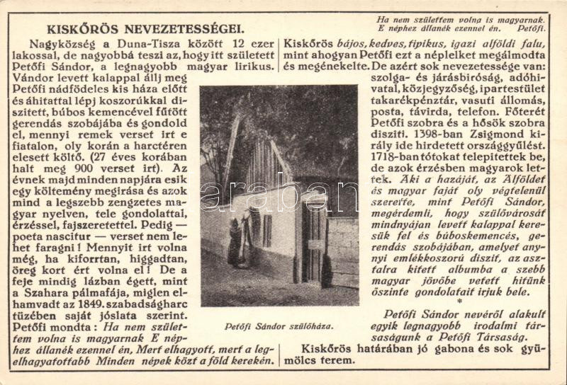 Kiskőrös nevezetességei, Petőfi Sándor szülőháza https://www.darabanth.com/de/187-Fernauktion/187.0/Ansichtskarten/Ungarn~3000004/Kiskoros-nevezetessegei-Petofi-Sandor-szulohaza~II692469
