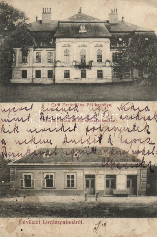 Beschreibung: Lovászpatona Esterházy Pál kastélya (ma általános iskola). Strausz Géza és fia vaskereskedése (kis szakadás / small tear)